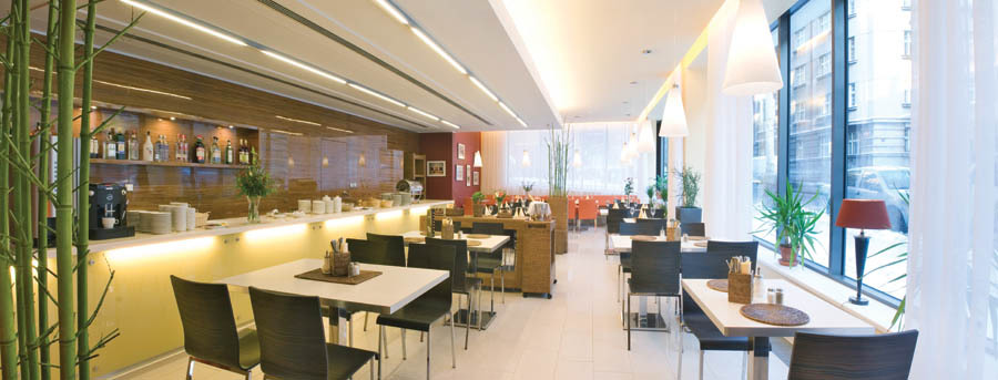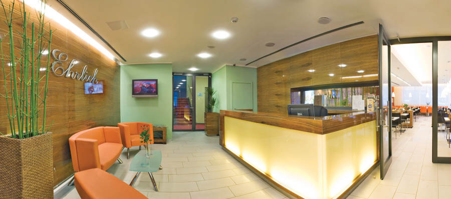 "Кафе Эрлих" на первом этаже, это идеальное место для приятного отдыха, корпоративных встреч или небольших общественных мероприятий. Элегантный и современный интерьер имеет емкость 50 человек.