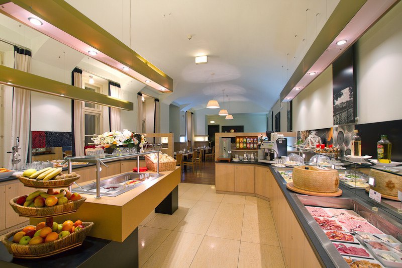 Богатый "шведский стол" включает различные горячие и холодные блюда, фрукты и овощи, большой мюсли-бар и салат-бар. А тем, кто поздно встает, предлагают по выходным завтрак до 12.00 часов или в будние дни завтрак по меню.